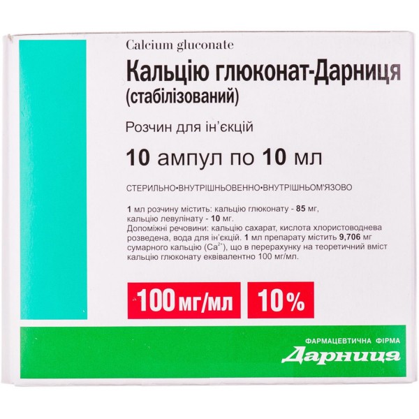 Inadequate parathyroid gland function, elevated calcium intake from the body (in particular, with prolonged dehydration) as an adjunct to allergic diseases (whey disease, urticaria, angioedema) and allergic complications of medication therapy, to reduce vascular permeability in pathological processes of a variety of genesis (exudative phase of inflammatory process, hemorrhagic vasculitis, radiation illness); with parenchymal hepatitis, toxic lesions of the liver, nephritis, eclampsia, hypercalemic form of paroxysmal myoplagia, skin diseases (skin pruritus, eczema, psoriasis), as a hemostatic agent, as well as an antidote for magnesium salts, oxalic acid or its soluble salts , soluble salts of fluoric acid.
