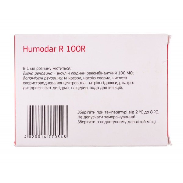 The dosage and injection time is set by the doctor individually, depending on diet, blood sugar levels, the needs of the patient. The selection of dose HUMODAR R 100R adult daily requirement for insulin is between 0.5 and 1 IU / kg body weight.