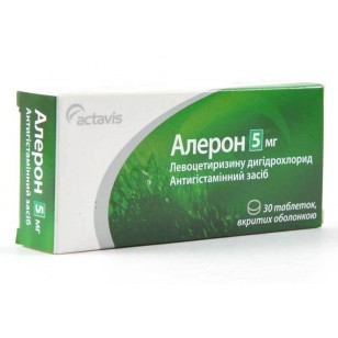 Aleron - antiallergic drug belonging to the group of antihistamines for 3 generations . Aleron contains the active substance levocetirizine - R- enantiomer of cetirizine , which is an active derivative of hydroxyzine . Aleron has anti -inflammatory, antipruritic , anti-inflammatory and antiekssudativnoe action. Indications for use : The drug used for the treatment and prevention of acute and chronic allergic diseases , including : - Allergic rhinitis and conjunctivitis (including seasonal and perennial ); - Urticaria (including drug is used to treat patients suffering from chronic idiopathic urticaria ); - Angioneurotic edema ( angioedema ); - Allergic dermatitis , which are accompanied by itching, burning and rashes on various parts of the skin and mucous membranes.
