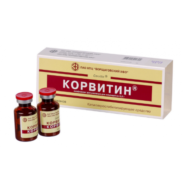 The subsequent introduction of a repeat in the same dose every 12 hours From 2 to 5 th day inclusive introduced 0.5 g of the drug dissolved Corvitin transferred in the amount of p-ra physiological sodium chloride solution, the amount of physiological r-ra -. 50-100 ml 2 times a day at intervals of 12 hours. Enter for 15-20 minutes.