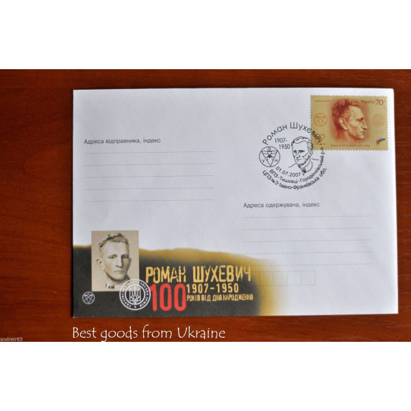 Here is Ukrainian postal envelope Roman Shukhevych 100 anniversary FDC sealed in Tyshkivtsi Ivano- Frankivsk region on 01.07.2007.